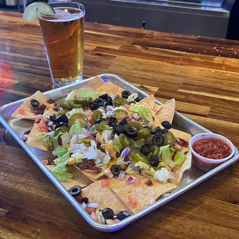 We threw everything but the kitchen sink on this bad boy! A mountain of crispy tortilla chips smothered in our creamy homemade beer cheese and hearty Guinness chili, then loaded with lettuce, tomatoes, red onions, jalapeños, black olives, salsa, and a dollop of sour cream. Feeling saucy?