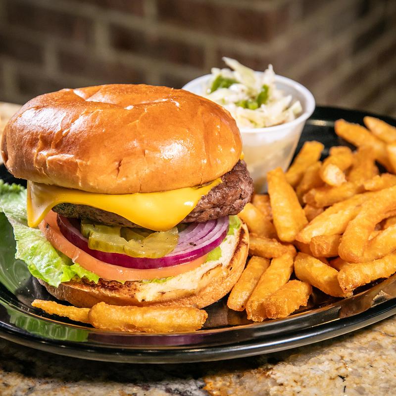 All Burgers are made with a juicy 1/2 lb hand-patted patty and served on a toasted brioche bun with fries and a taste of our secret recipe slaw.