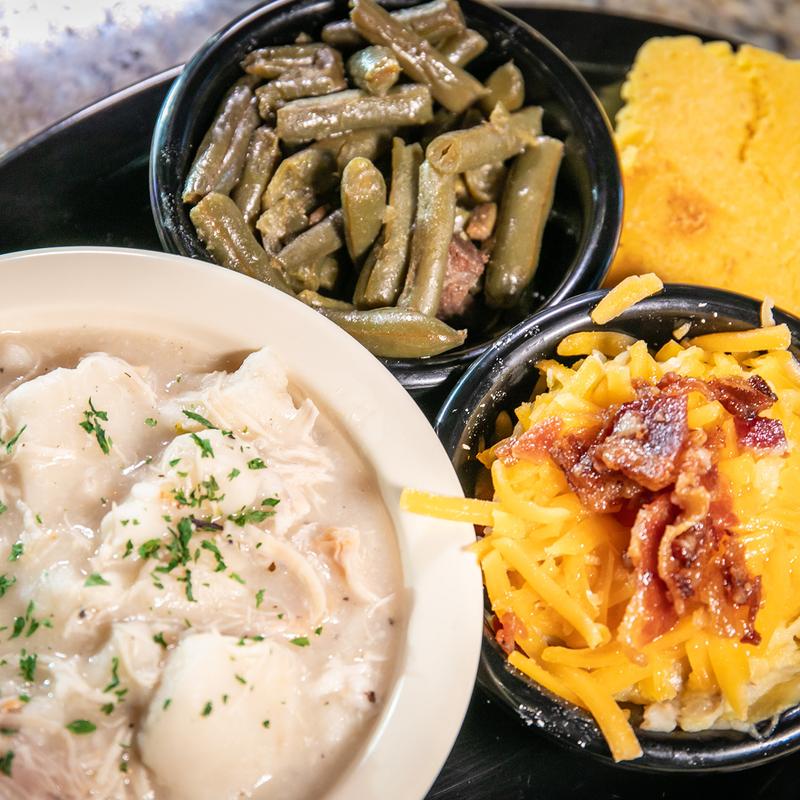 Tender chicken and fluffy dumplings simmered in a rich, savory broth. Served with green beans, slaw, and a slice of our homemade cornbread. Pure comfort in a bowl.