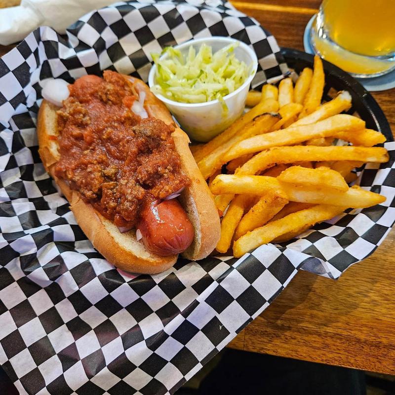 A quarter-pound all-beef hot dog topped with our house-made Guinness chili and fresh red onions. Comes with crispy fries and a taste of our secret slaw.